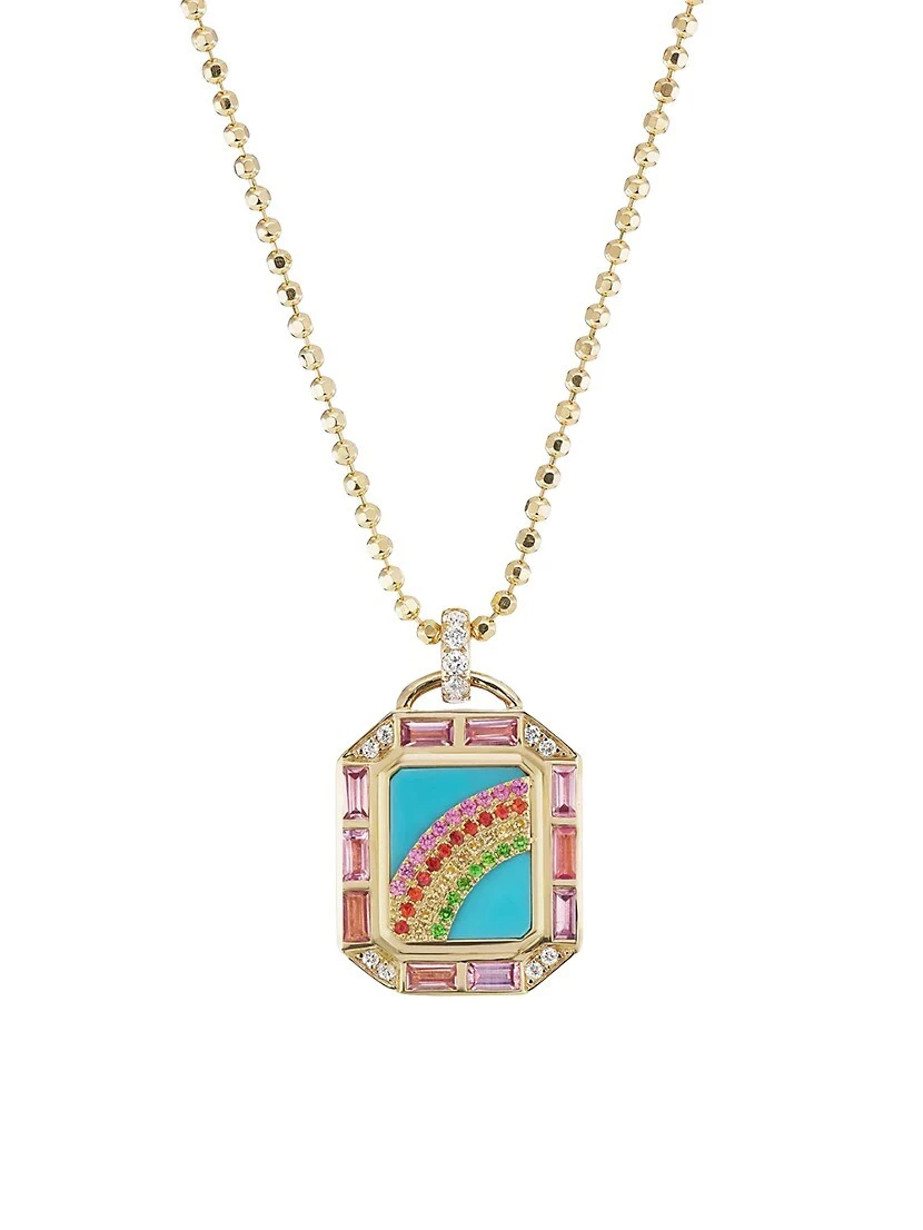 From the Tarot Collection. Adorned with a sparkling sapphire rainbow, Sorellina’s Tarot Il Arco necklace is crafted from bright turquoise and trimmed with sapphire baguettes and diamonds.