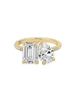VRAI’s Toi Et Moi 18K-yellow-gold engagement ring showcases emerald and pear-shaped lab-grown diamonds on a thin band celebrating a perfect union.