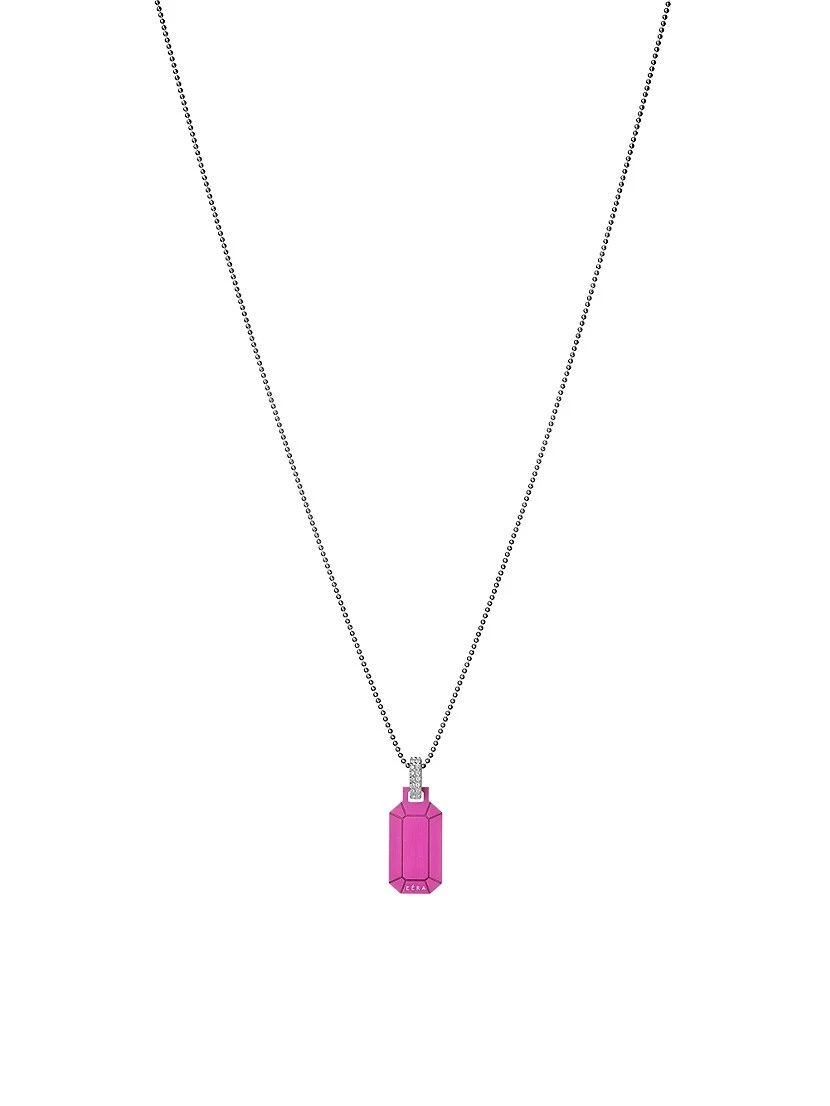 Crafted of 18K white gold and sterling silver, EÉRA’s Tokyo necklace features a fuchsia gemstone-inspired dog-tag pendant. This chic embellishment is suspended from a fine ball chain via a white-diamond-encrusted bail.