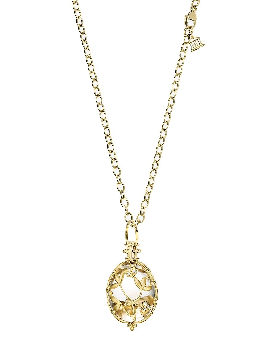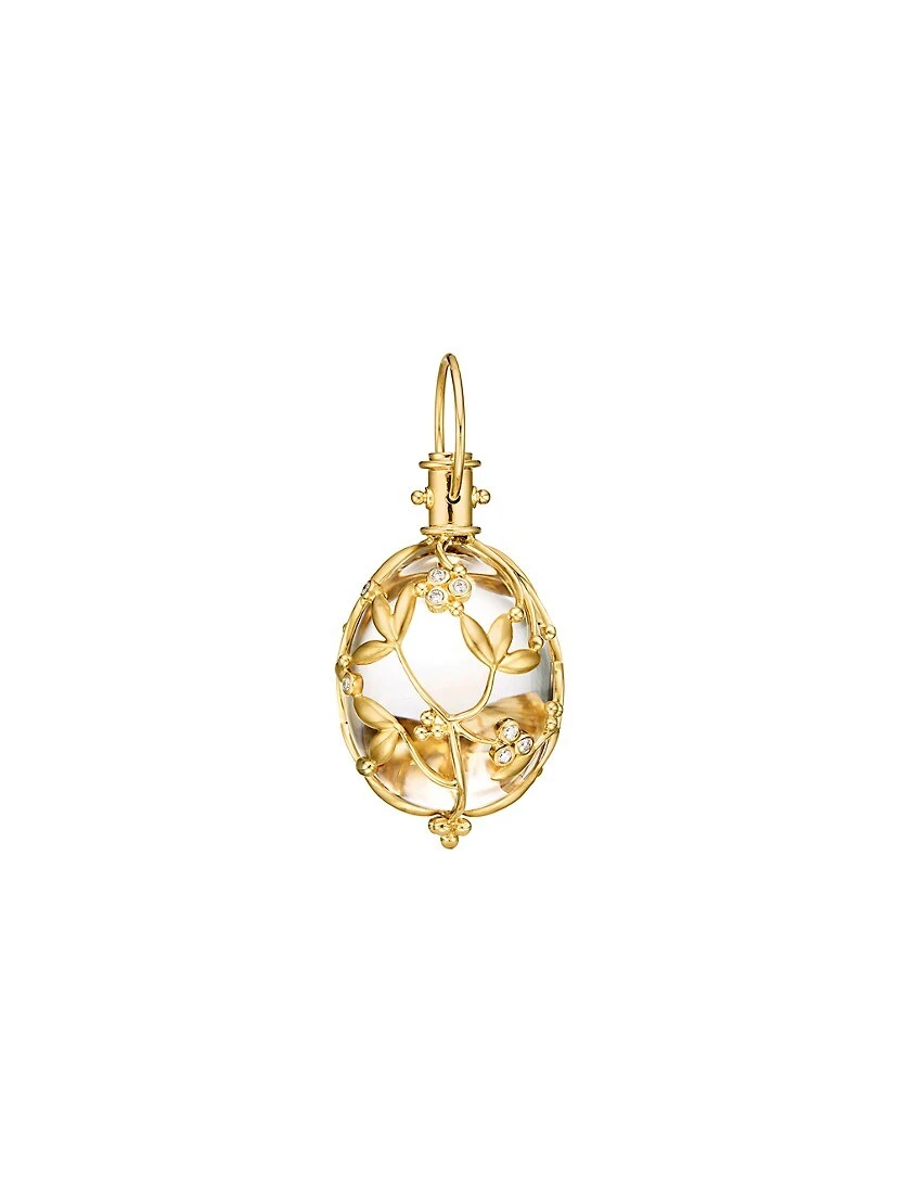 From the Tree of Life Collection. Graceful vines of polished and brushed 18k yellow gold, blossoming with diamonds and granulated dots, trellis a teardrop rock crystal amulet.