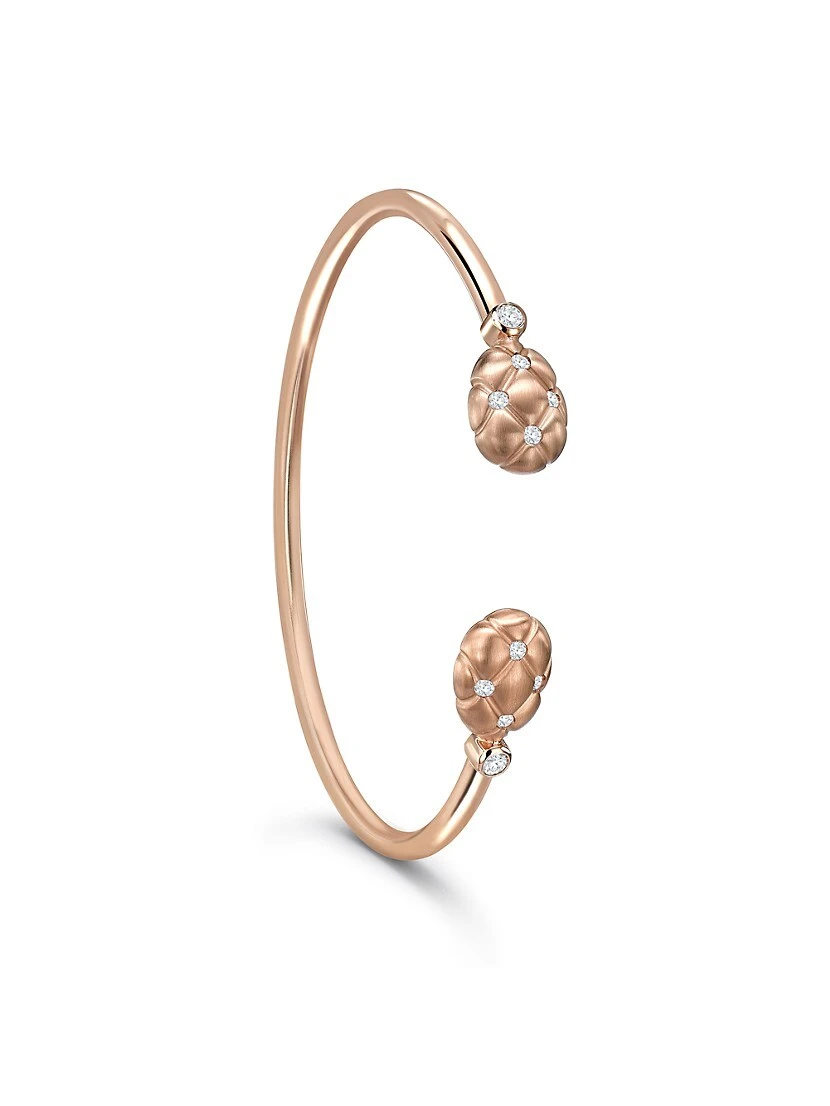 From the Treillage Collection. Inspired by the Diamond Trellis Egg, this open-set bracelet pairs heritage and modernity with two quilted eggs, designed with a brushed finish and a concealed ruby surprise on the inside of the bracelet.