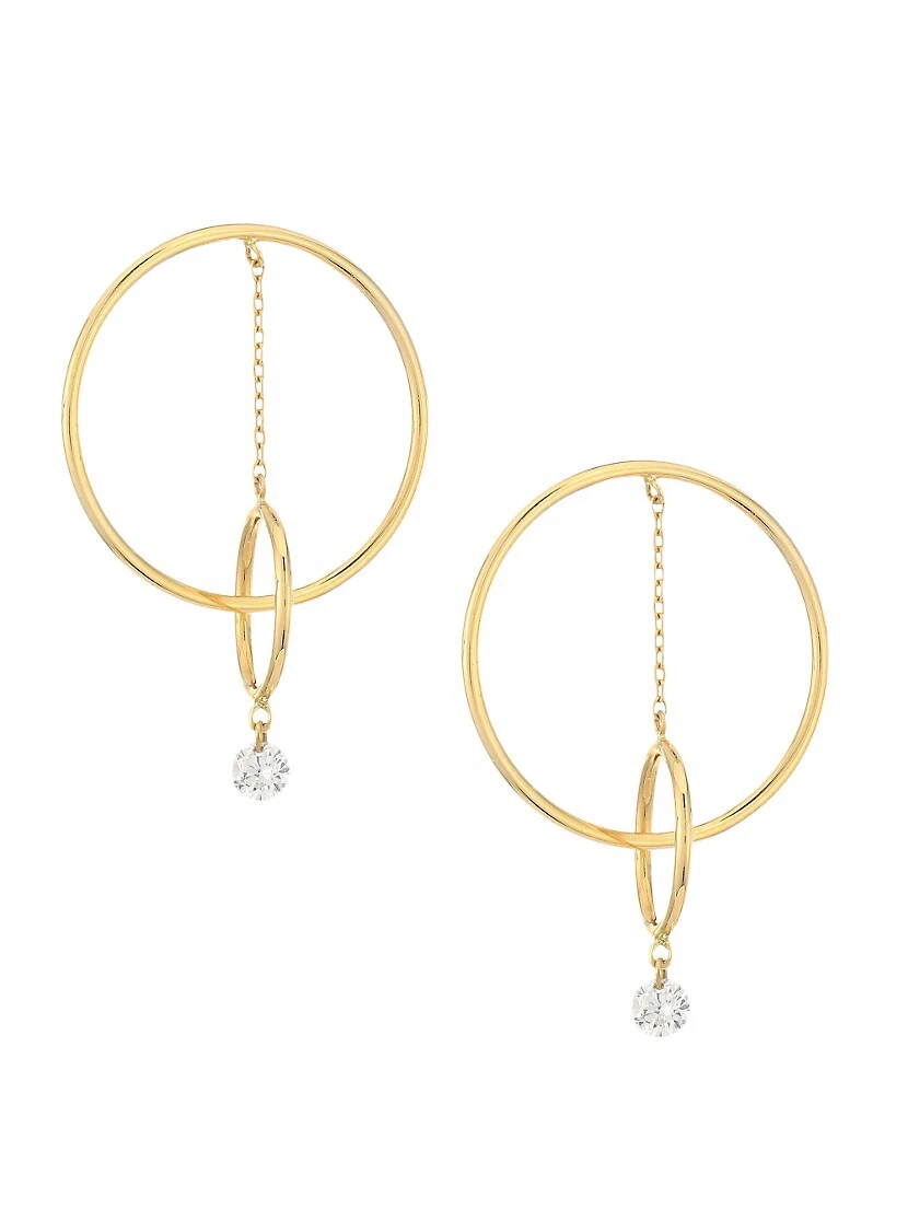 Modern geometric earrings feature interlocking hoops connected by a fine chain suspending a single shimmering diamond, creating the illusion of a floating hoop.