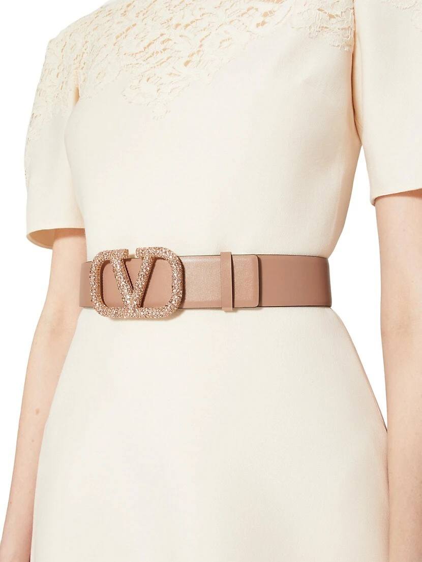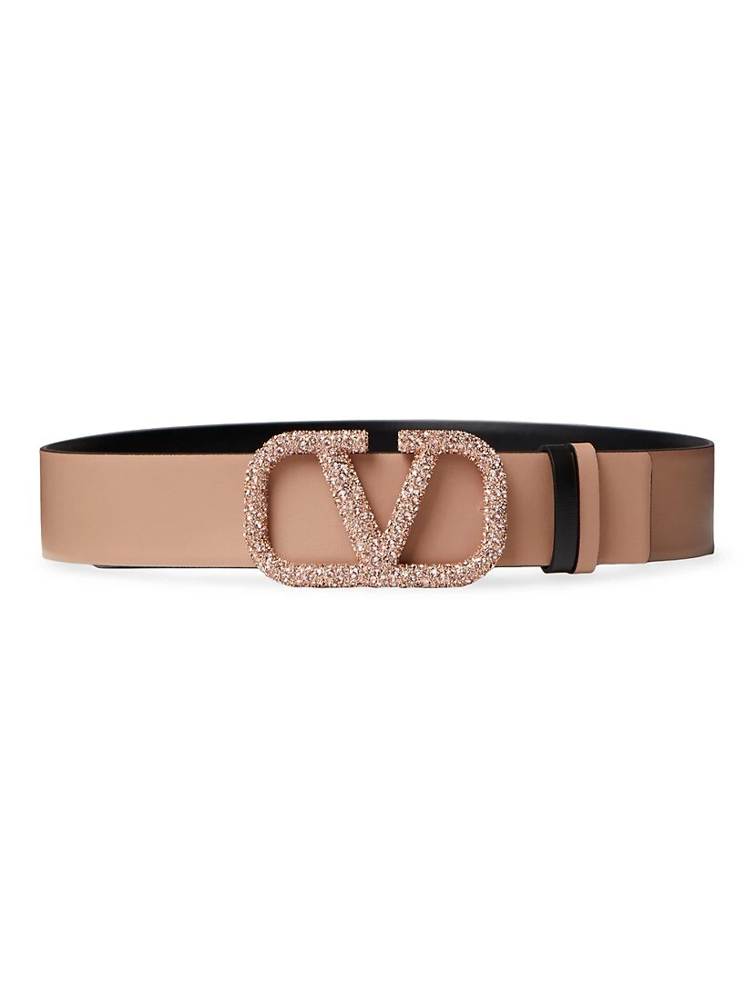 Valentino Garavani VLogo Signature reversible belt in shiny calfskin, VLogo Signature buckle adorned with Swarovski® crystals.