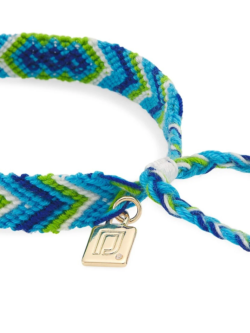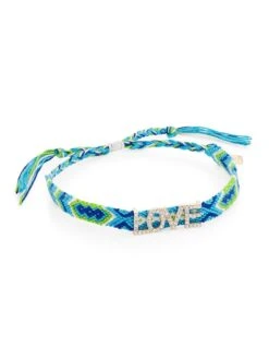 DANNIJO’s blue, green, and white cotton Waikiki bracelet is embellished with a crystal-encrusted goldtone “Love” charm. Founded by Florida-born sisters Danielle and Jodie Snyder, the clothing and accessories label is renowned for its bold, colorful designs.