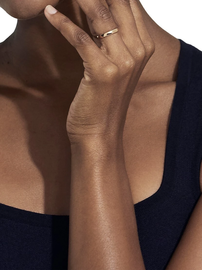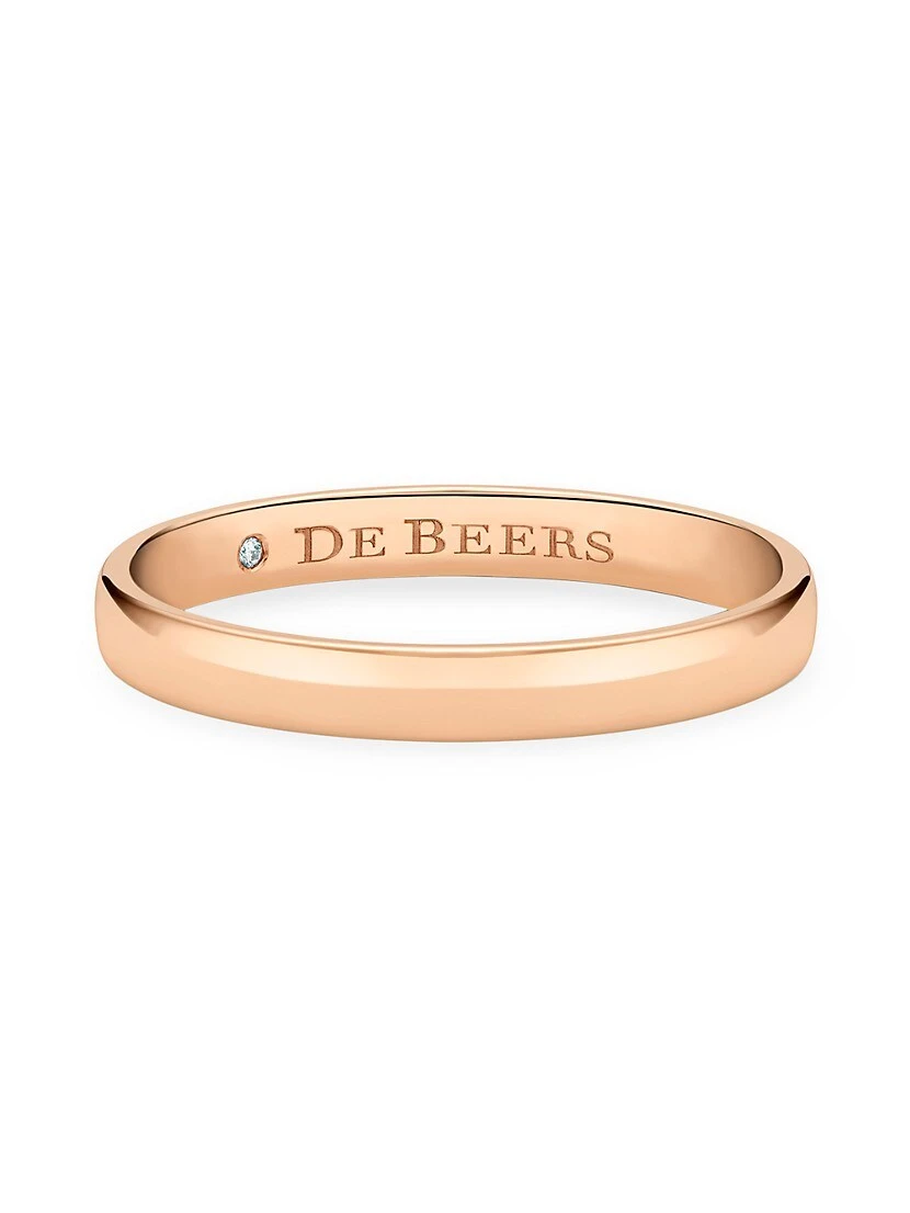 Simple, clean and sculptural, De Beers’ classic Wide Court Band wedding ring is crafted from 18K rose gold with a concealed round brilliant diamond inside the band.